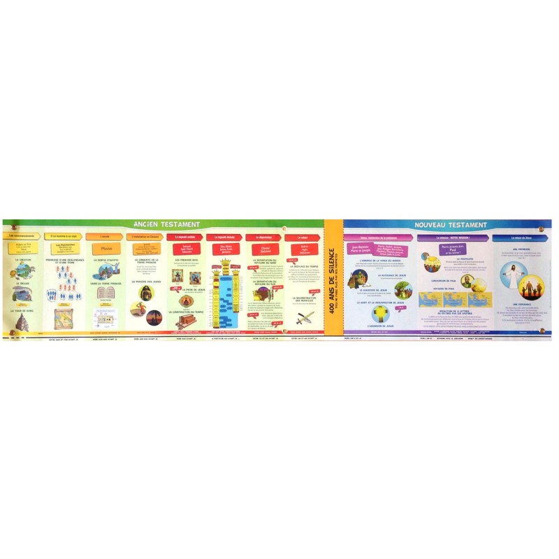 Une frise avec les grandes histoires de la Bible chronologiquement. Utile pour illustrer les méditations ou les histoires.