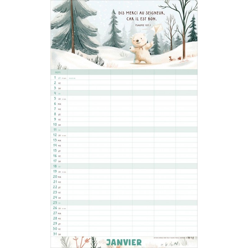 Avec ce planning pour la famille, vous avez une vue d'ensemble de tous les rendez-vous - une véritable aide pour organiser la vie de famille. Des dessins amusants et des versets bibliques inspirants enrichissent ce planning à six colonnes.