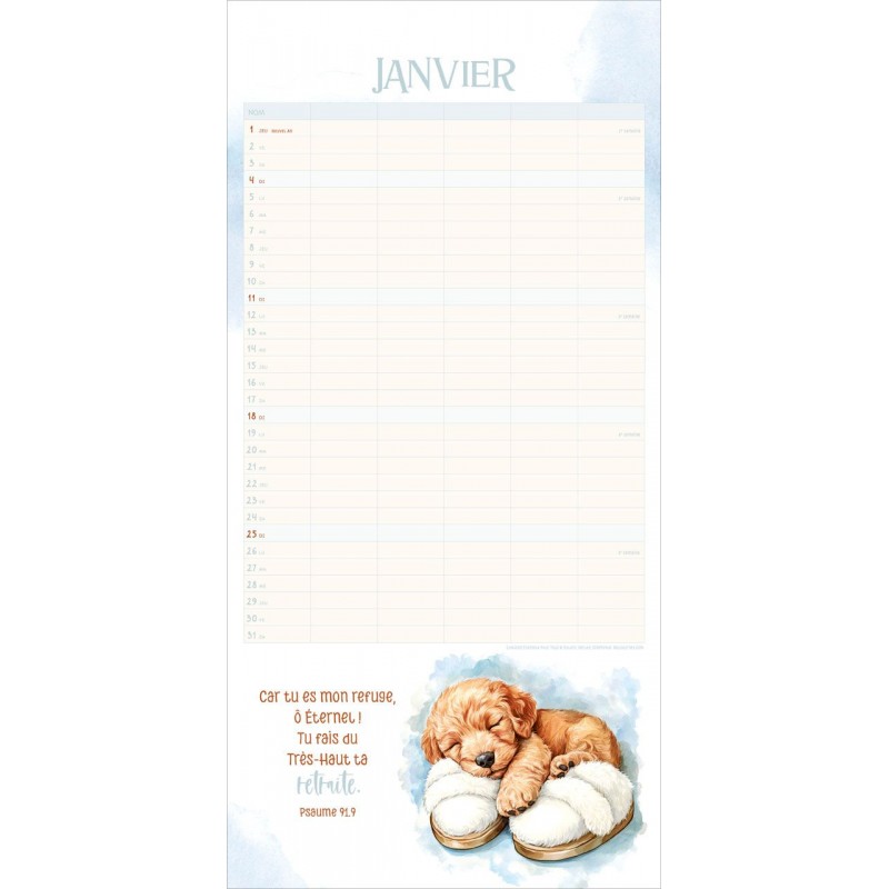 Grâce à notre nouveau Planning Famille, vous n’oublierez plus jamais un rendez-vous. Cinq colonnes offrent de l’espace pour de nombreux rendez-vous et inscriptions.Le calendrier avec de belles aquarelles est très décoratif. Enfin, les citations bibliques accompagnent la famille tout au long de la journée.