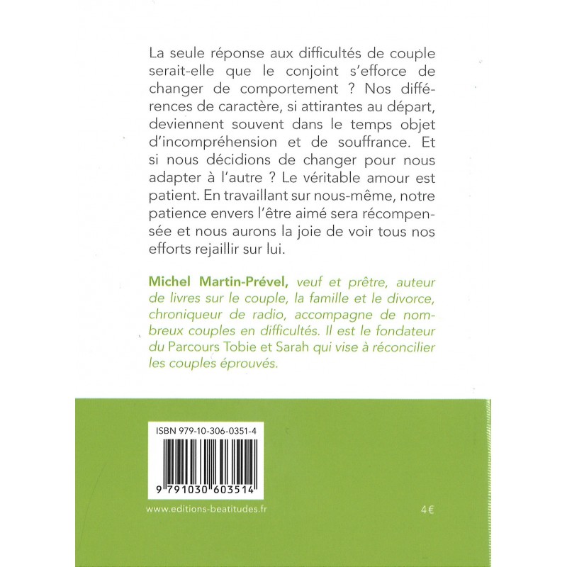 Et si nous décidions de nous changer nous-même pour nous adapter à l’autre plutôt que de vouloir à tout prix le changer ? Le véritable amour est patient. Ainsi, vivre ses valeurs personnelles les fait transpirer sur l’autre, les époux s’influençant l’un l’autre au long des années jusqu’à se supporter dans leurs différences et même de s’en réjouir un jour.