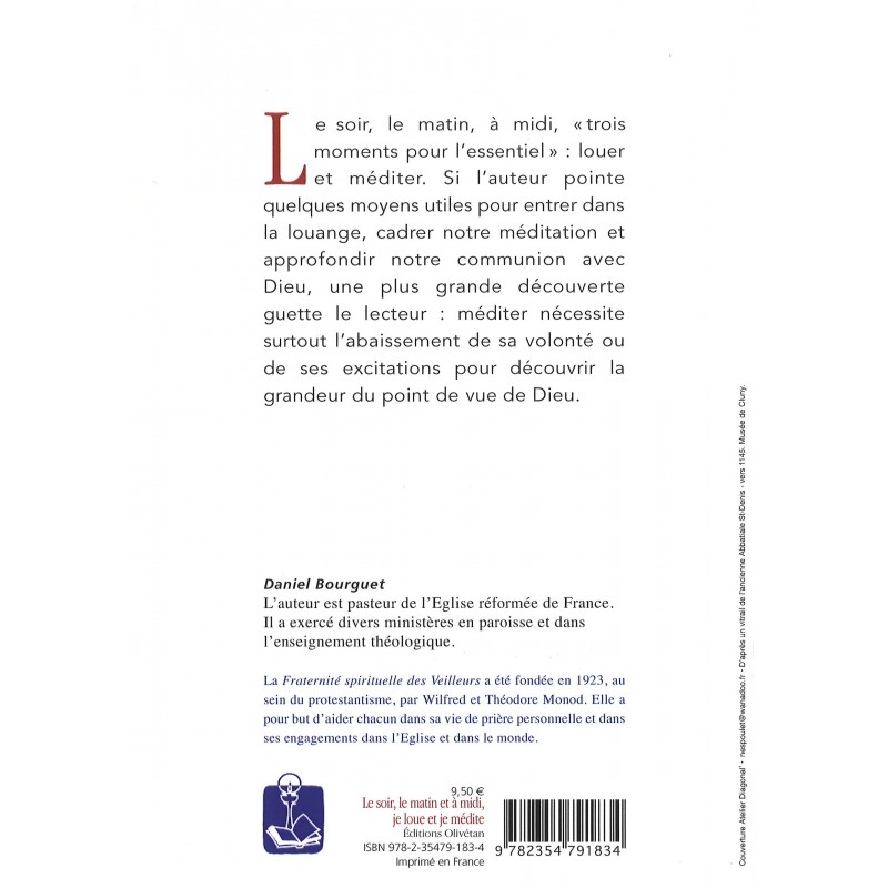 Le soir, le matin, à midi, «trois moments pour l'essentiel» : louer et méditer. Si l'auteur pointe quelques moyens utiles pour entrer dans la louange, cadrer notre méditation et approfondir notre communion avec Dieu, une plus grande découverte guette le lecteur : méditer nécessite surtout l'abaissement de sa volonté ou de ses excitations pour découvrir la grandeur du point de vue de Dieu.
