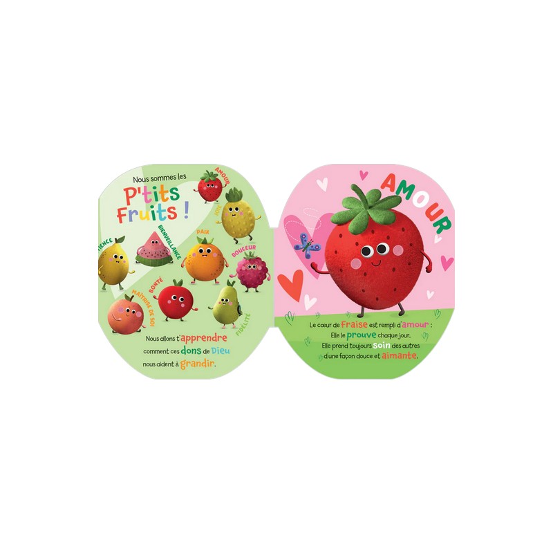 L’amour, la joie, la paix, la gentillesse, la bienveillance, la bonté, la fidélité, la douceur et la maîtrise de soi, sont ici représentés sous la forme de véritables fruits : la fraise – héroïne de ce livre – mais aussi, l’ananas, l’orange, le citron, la pastèque, la pomme, la poire, la framboise et la pêche.