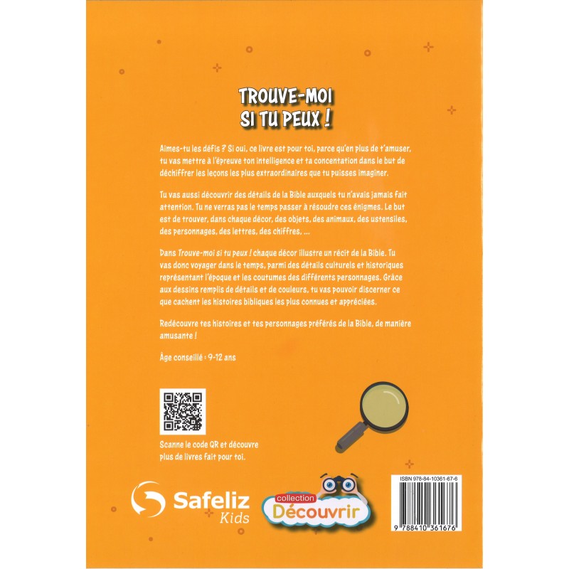 Dans Trouve-moi, si tu peux ! chaque décor illustre un récit de la Bible. Tu vas donc voyage dans le temps, parmi des détails culturels et historiques représentant l'époque et les coutumes des différents personnages. Grâce aux dessins remplis de détails et de couleurs, tu vas pouvoir diserner ce que cachent les histoires bibliques les plus connues et appréciées.