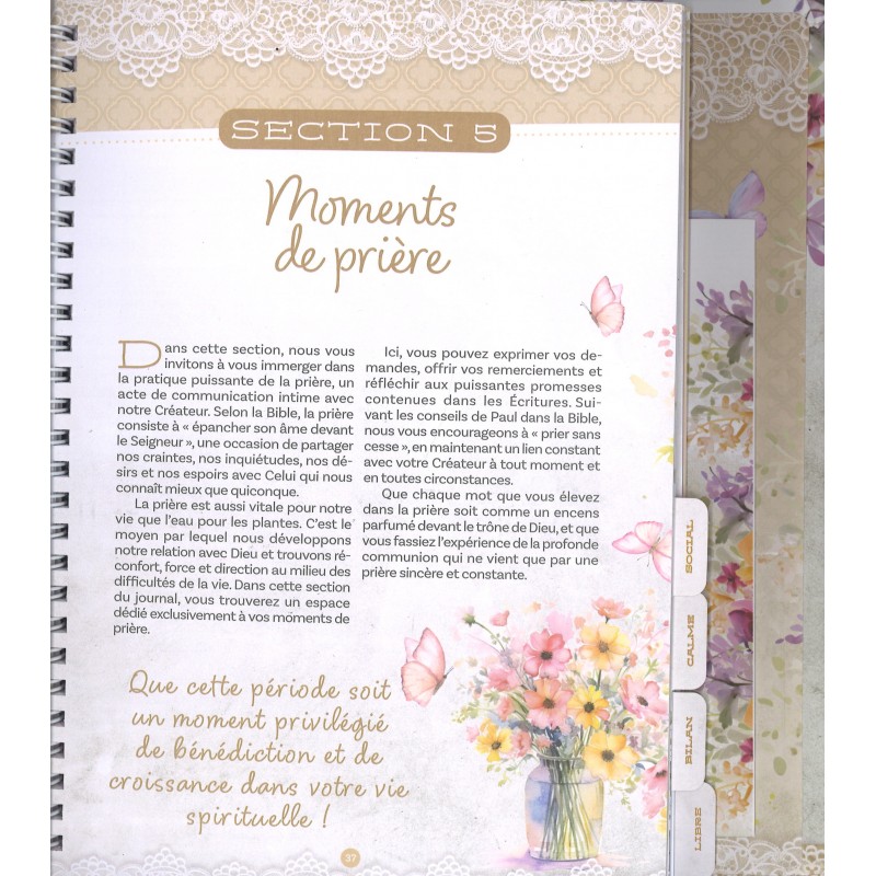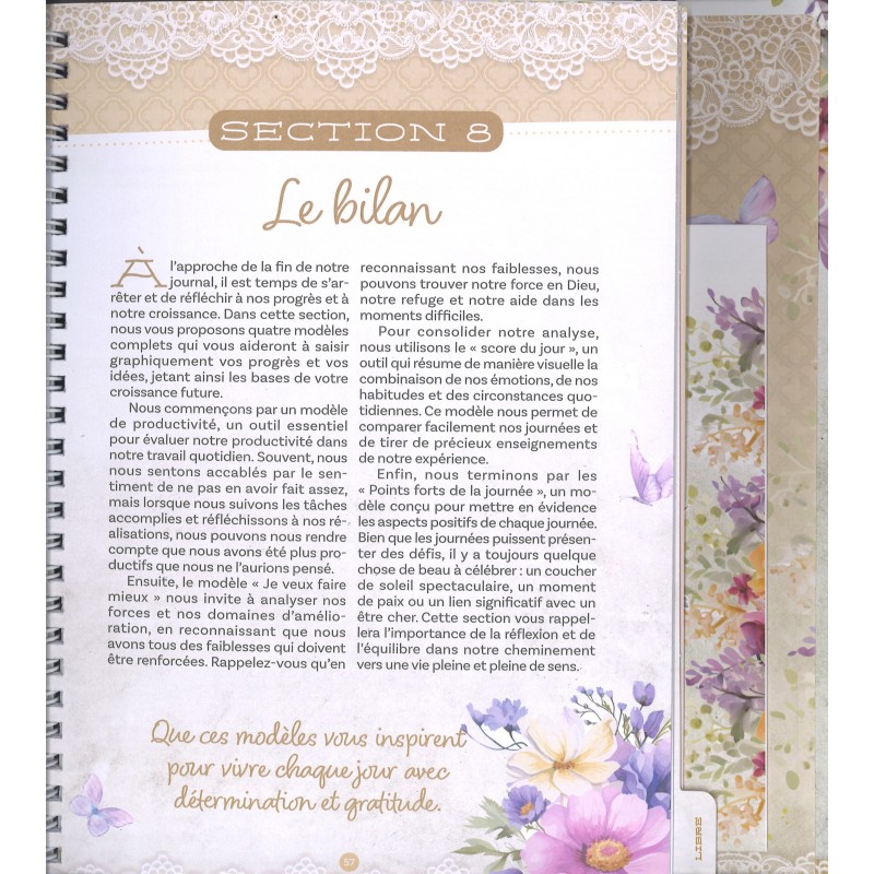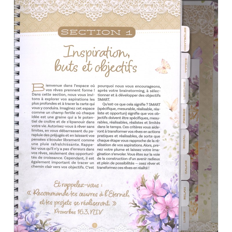 Vous pourrez y consigner vos objectifs, le déroulement de vos journées, vos sentiments, vos lectures et bien d'autres choses encore. Il offre également des moments de calme au milieu des défis.