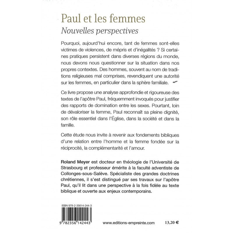 Si certaines pratiques persistent dans diverses régions du monde, nous devons nous questionner sur la situation dans nos propres contextes. Des hommes, souvent au nom de traditions religieuses mal comprises, revendiquent une autorité sur les femmes, en particulier dans la sphère familiale. Ce livre propose une analyse approfondie et rigoureuse des textes de l’apôtre Paul, fréquemment invoqués pour justifier des rapports de domination entre les sexes. Pourtant, loin de dévaloriser la femme, Paul reconnaît sa pleine dignité, son rôle essentiel dans l’Église, dans la société et dans la famille. Cette étude nous invite à revenir aux fondements bibliques d’une relation entre l’homme et la femme fondée sur la réciprocité, la complémentarité et l’amour.