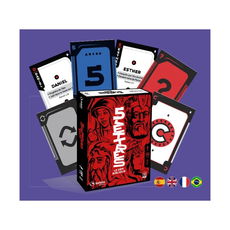 Dans 5 lettres : le défi biblique, chaque joueur se lance dans un voyage à travers les histoires et les personnages des Ecritures. Débarrassez-vous rapidement de vos cartes en mentionnant des noms bibliques, en changeant des lettres et en mettant vos amis au défi de deviner le nom des personnages. C'est une façon captivante de tester votre mémoire et d'approfondir votre connaissance de la Parole de Dieu. Préparez-vous à vous amuser, à rire et à faire des découvertes avec 5 lettres : le défi biblique.