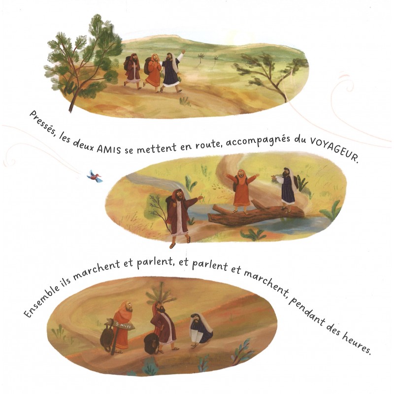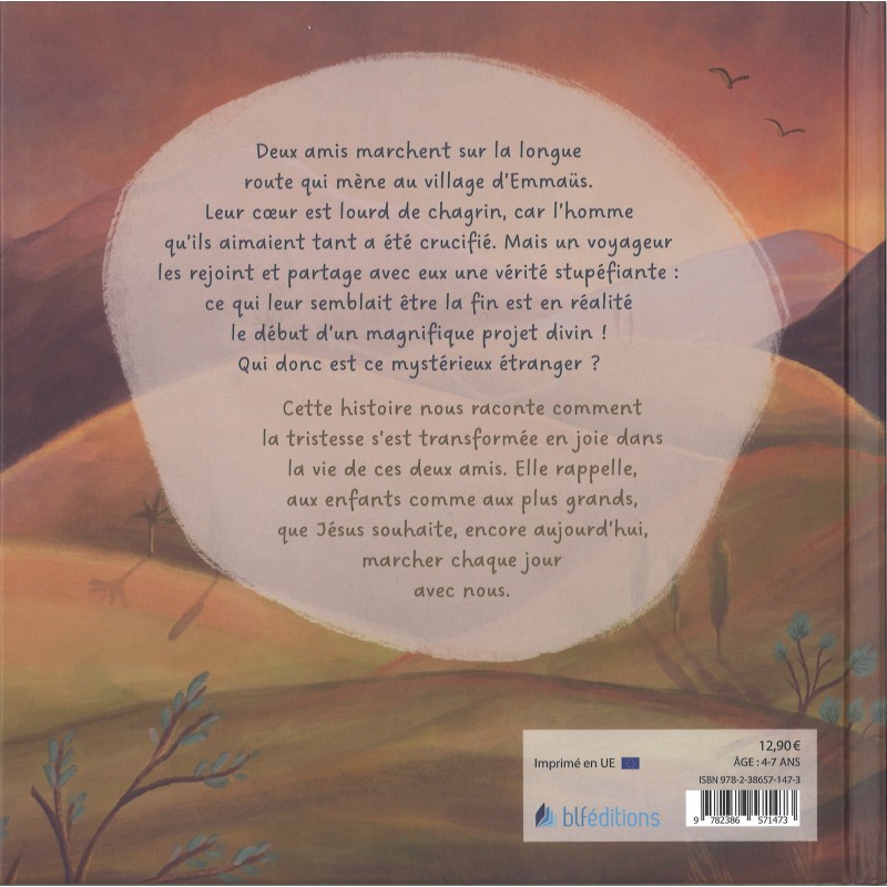 Cette histoire nous raconte comment la tristesse s’est transformée en joie dans la vie de ces deux amis. Elle rappelle, aux enfants comme aux plus grands, que Jésus souhaite, encore aujourd’hui, marcher chaque jour avec nous.